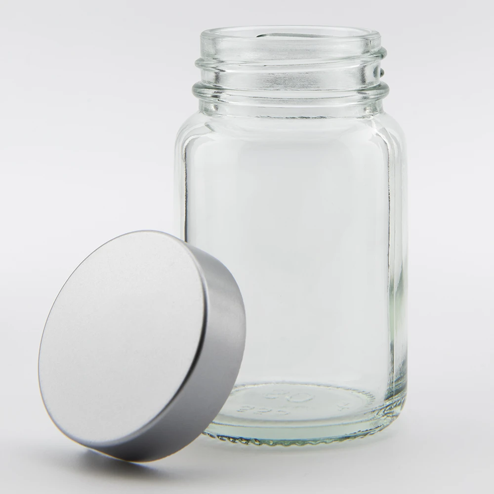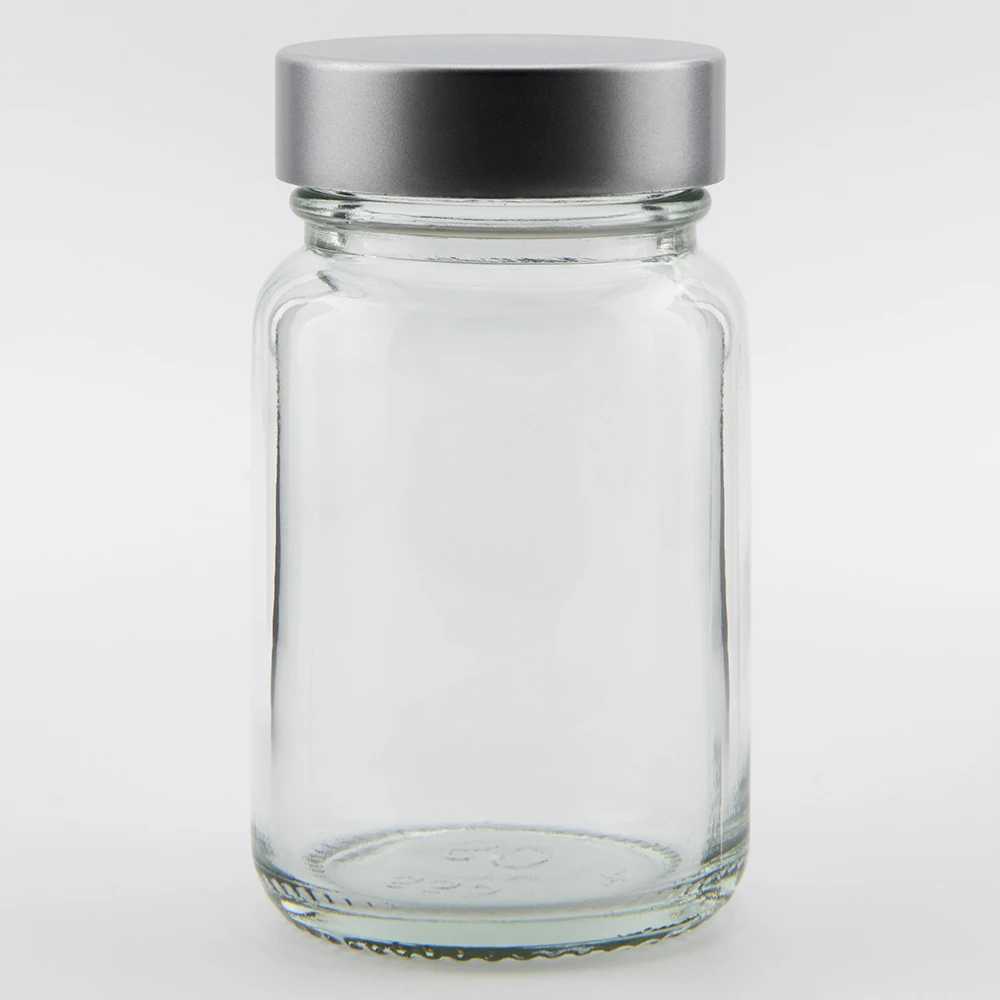 4oz 118ml Clear Glass Powder Jar and R3/38 White Urea PVDC lined cap sprayed matt silver quantity